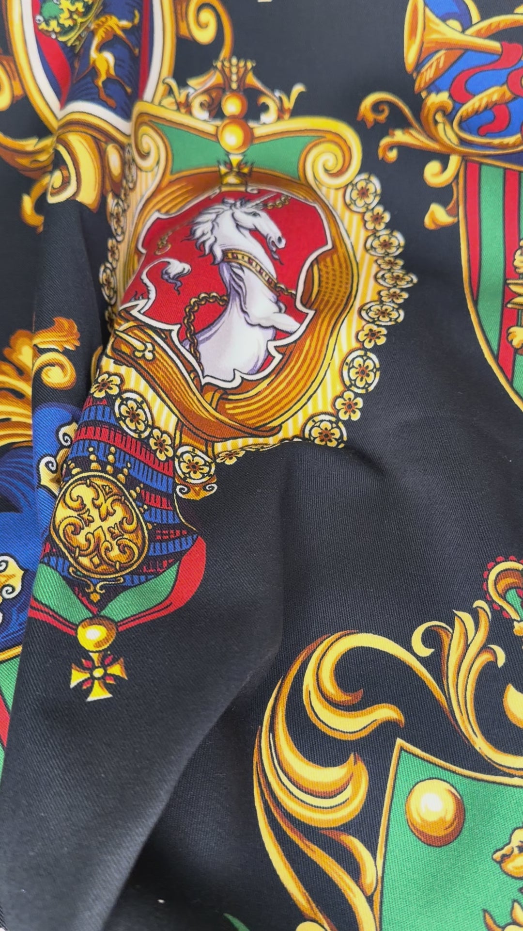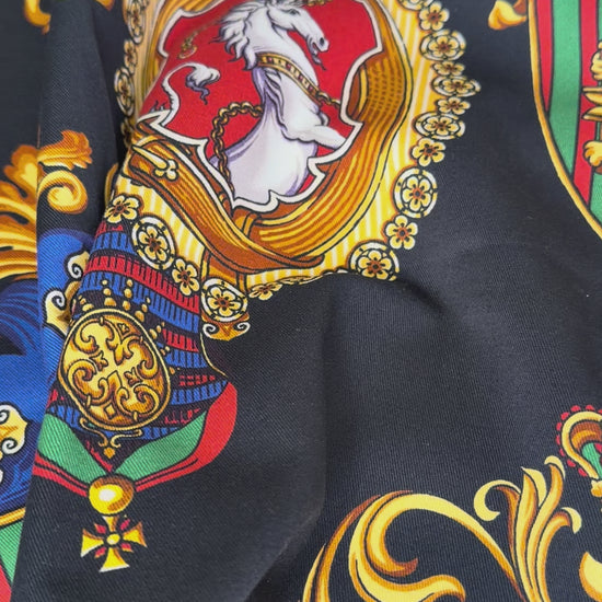 This is an Italian-sourced 100% cotton twill with Dolce & Gabbana branding and iconic emblems. This iconic pattern has been featured on tee shirts for the brand. Perfect for apparel projects, home décor accents, or designer-inspired creations.